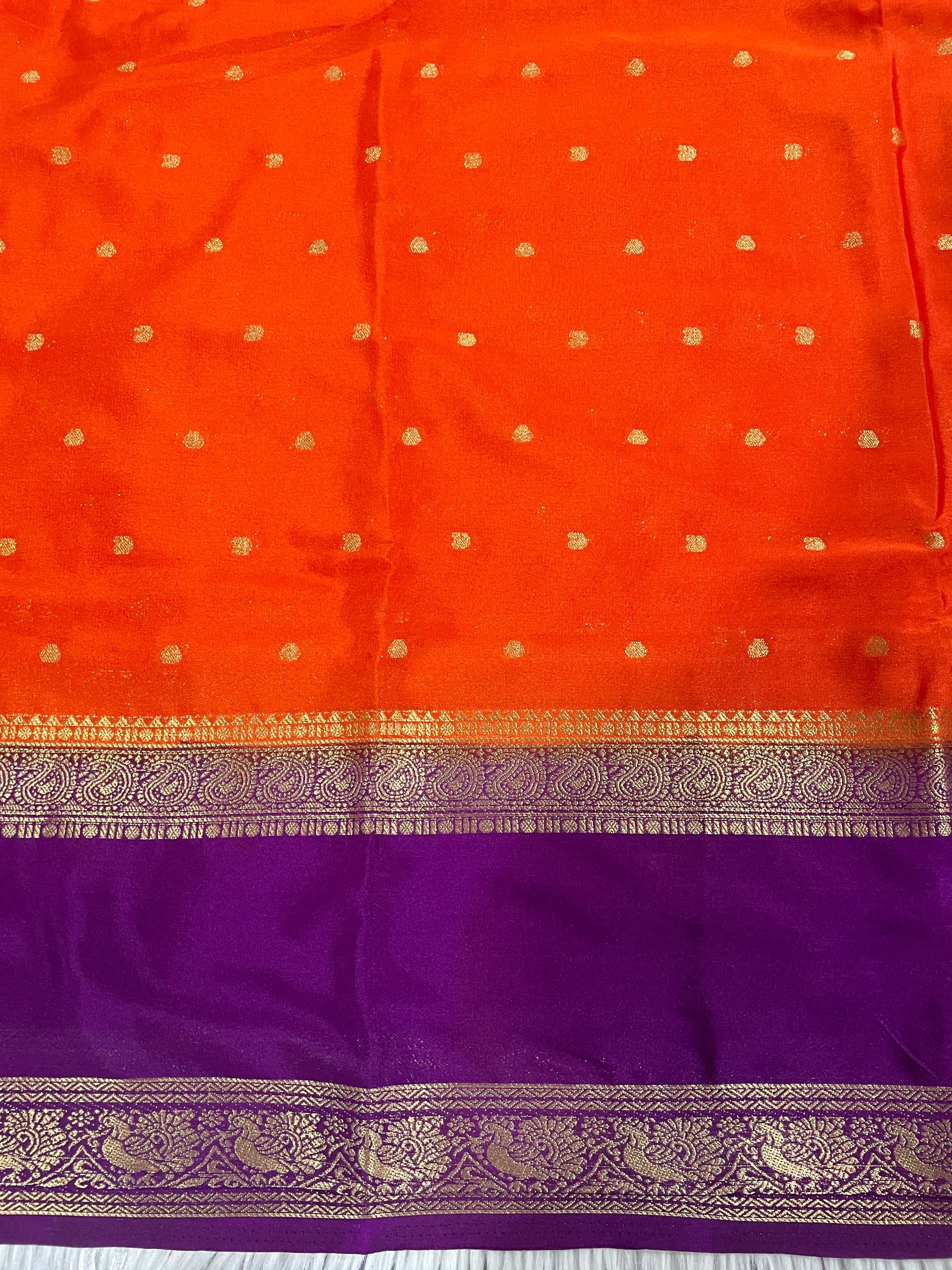 Elevate your ethnic wardrobe with this striking Orange and Purple Semi Mysore Crape Silk Saree, a perfect blend of traditional craftsmanship and contemporary aesthetics. Woven from premium semi-Mysore silk, this saree offers a luxurious drape with a subtle sheen that catches light beautifully. The vibrant orange and purple color combination creates a bold, sophisticated statement suitable for festive occasions, celebrations, and special events. The semi-Mysore silk fabric provides excellent durability while maintaining the characteristic softness and breathability of traditional silk. This versatile piece pairs effortlessly with classic gold jewelry and traditional accessories, making it an essential addition to any saree collection.