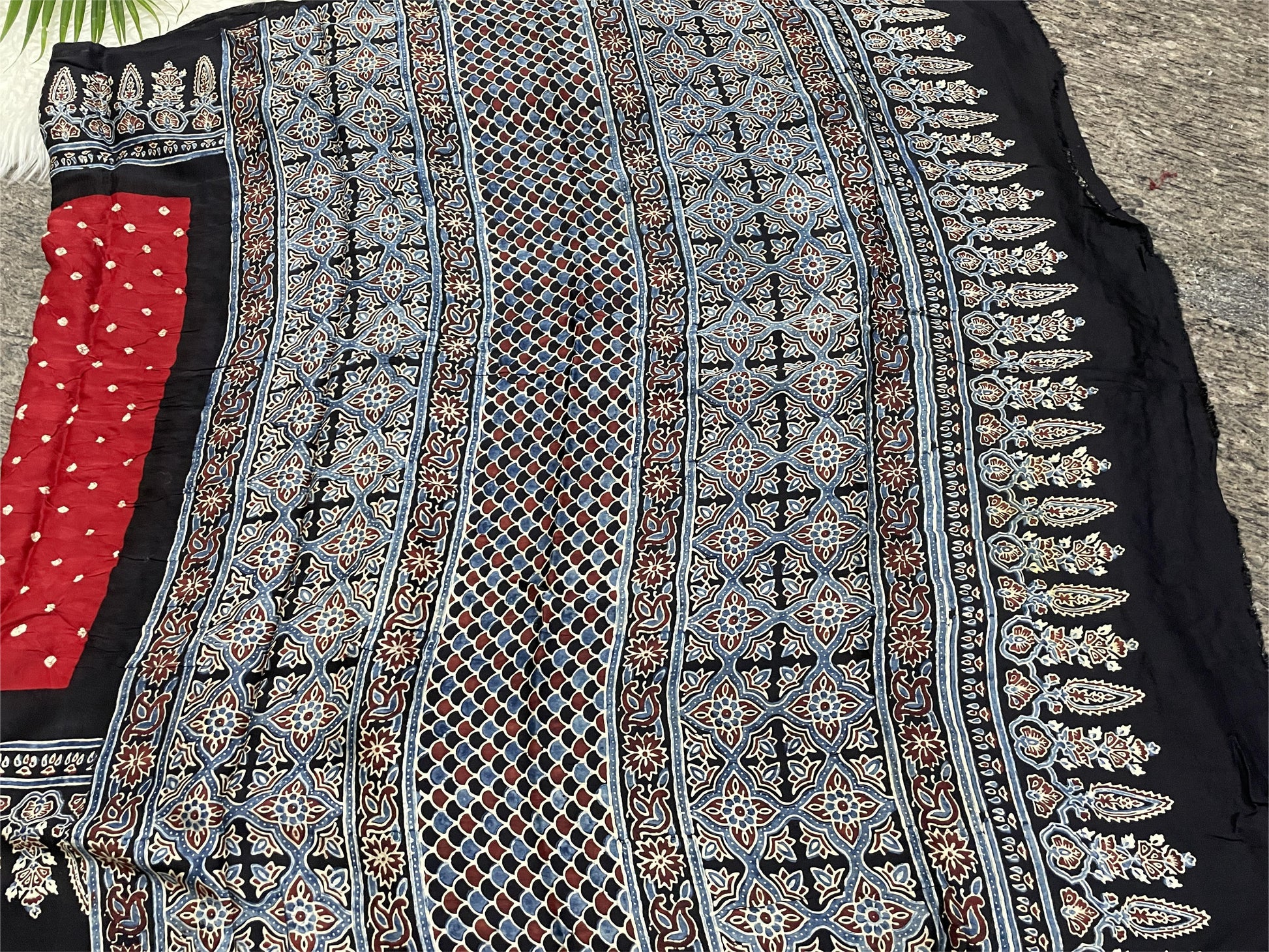 Drape yourself in timeless elegance with this striking red modal saree, elevated by intricate bandini (tie-dye) detailing. The soft, breathable modal fabric offers superior comfort and a luxurious drape, making it ideal for both festive occasions and everyday wear. The bandini pattern creates a sophisticated visual texture that catches light beautifully, while the rich red hue commands attention. Perfect for those who appreciate handcrafted textiles and refined traditional aesthetics. A versatile investment piece that transitions seamlessly from celebrations to intimate gatherings.